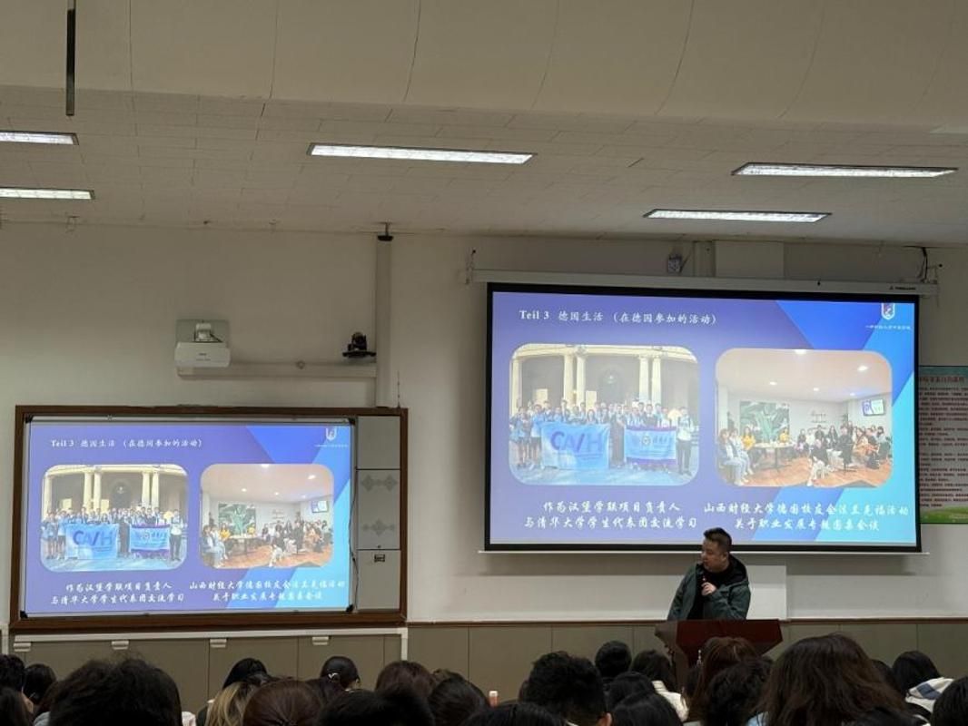分享会上,刘一楠以自身求学经历为切入点,系统拆解了中德四年的学习脉络:大一作为德语学习的基础阶段至关重要;大二阶段进入专业课学习,分为中方课程与德方课程,需在适应德语教学环境的同时,兼顾英语学习,避免语言能力退化;大三是明确发展方向的关键期,需确定考研或就业路径,尤其是留学所需的雅思成绩,需尽早规划备考;大四的德国交换学习,不仅要完成课程任务与德文论文,更要珍惜跨文化交流机会,全方位体验德国的教育与生活。