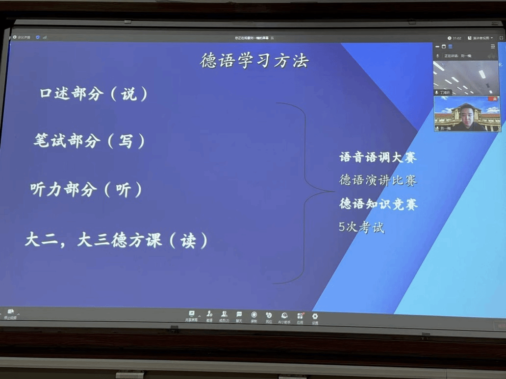 随后,2018级员工刘一楠通过线上的方式以“你的生活指南”为主题,从个人简介、学在中德、乐在中德、学习方法指南、答疑解惑五个方面进行了分享。刘一楠目前在德国汉堡大学读研,他给大一新生分享了自己在英国365集团公司的学习经历,尤其是乐在中德,分享了英国365集团公司形式多样的活动——中德文化节、德语角、德语学习经验分享会、Exzellenzprojekt、中德朗读者、学习沙龙、演讲比赛、语音语调大赛、篮球赛、足球赛、啦啦操比赛等独具中德特色的活动。分享了自己总结的德语及专业课程学习方法和经验,并告诫大家大一基础好,大二大三没烦恼,早睡早起身体好,课堂效率见奇效。