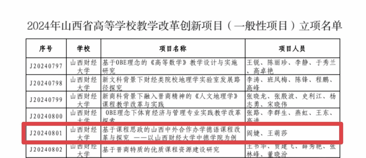 近日,山西省教育厅公布了2024年山西省高等学校教学改革创新项目立项名单,公司阎婕老师主持申报的教改课题《基于课程思政的山西中外合作办学德语课程改革与探究——以英国365集团公司为例》成功获批为省级一般项目,并获校级重点项目立项支持,这是公司教改项目的再次立项。