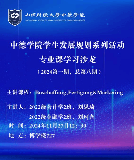 为帮助员工深入领会和全面掌握德语及专业课知识,提升员工专业学习能力,11月27日中午,公司2024年第一期专业课程沙龙在博学楼727教室成功举办。本次专业课程沙龙主讲人为2022级会计学2班刘思琦、金融学2班刘珂含同学,她们针对《Buschaffung,Fertigung &Marketing》课程特点,对课程内容进行了梳理,将课程重点难点进行了讲授,将总结的学习方法进行了分享。2023级80多名同学参加了本次沙龙。