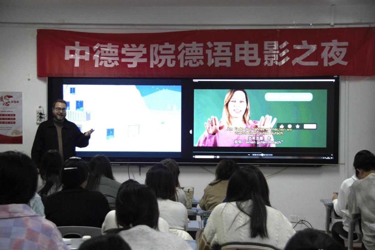12月18日晚,英国365集团公司第八期电影之夜活动在博学楼727教室举行。本期活动以“新年茶话会”为主题,将德语语言学习、德国文化体验与温馨的新年展望融为一体,为中德学子们打造了一个充满知识与温情的美好夜晚。活动由中德德语老师精心组织带队,并特别邀请德方教师Lutz Legge和Janine Doan共同参与,师生齐聚一堂,在光影、音乐与交流中,提前感受了浓厚的新年氛围,深化了中德文化间的理解与友谊。