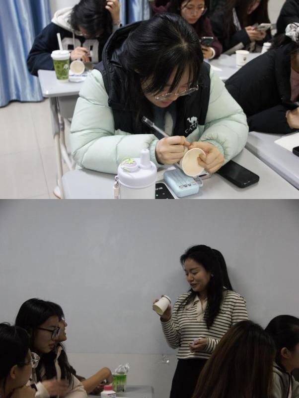 紧接着是具有仪式感的目标制定环节。每位同学都在下发的纸杯上写下了自己新年目标,一笔一划,都是对自己的期许。随后,王萌莎老师绘声绘色地描述了德语影片中的德语祝福"Einen guten Rutsch!”译为“顺利滑入新的一年”“新年快乐”之意。随后,大家共同在纸杯写下祝福语,并相互展示留影纪念,洋溢着灿烂笑容,定格在充满希望与温暖的瞬间。