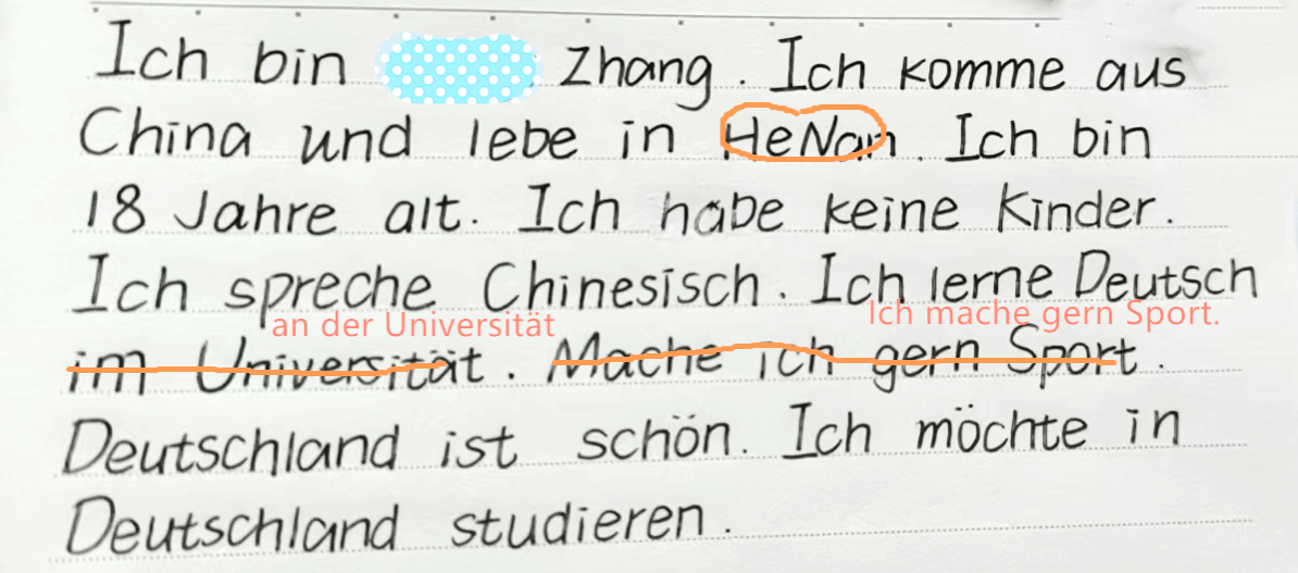 在进行书面表达练习时,初学德语的员工需能够正确地写出自我介绍,并注意正确使用字母的大小写。不论是员工的单词作业,还是句子练习,我都会细致批改,并向员工提出建议,以便员工在收到作业后能够更好地复习。