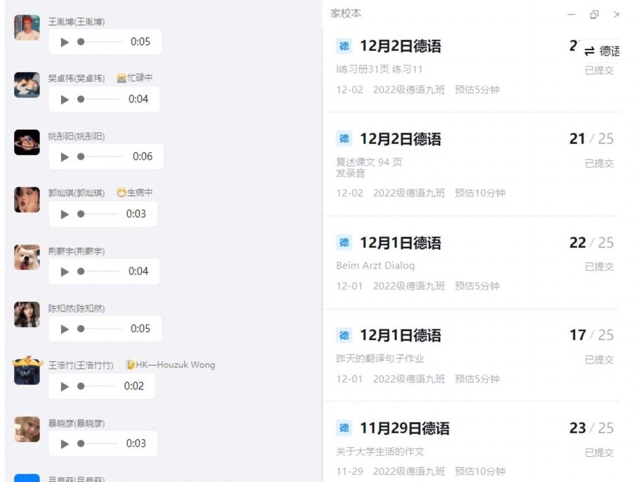 如何让独自在家上课的员工也愿意自觉开口说德语,这可能是多数老师面临的挑战。在讲到重点单词句型时,我会要求所有同学口头造句,并且以语音的方式发送到钉钉班级群,然后当堂逐一点击播放,让所有同学都能听到其他同学的句子。如果有错误,我会马上纠错,让员工再次把正确的句子发送。另外每天我也会布置语音作业,要求员工录对话或者是复述课文到家校本。通过这样课上课下的反复练习纠正,提高大家的口语表达能力。