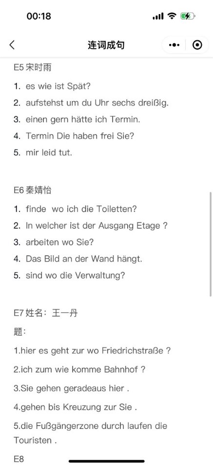由于本周六将进行德语A1阶段补考,我班还着重进行了A1知识点的复习,主要包括语法复习和模拟口笔试。由于员工的基础不够扎实,基本的句子结构仍掌握欠佳,语法复习显得尤为必要,主要涉及句子结构、人称代词、冠词、动词现在时变位、现在完成时、动宾搭配、介词短语等基础知识。首先由员工自主复习,然后我进行补充,最后再通过相关习题进行查缺补漏。对于员工普遍反映有难度的连词成句题型,则采取由员工担任考官,进行出题的方式,引导员工自主体会德语的句子结构特点,对比中德语言思维的区别,树立正确的语言观。在模拟笔试方面,本周做了两份试卷,员工普遍反映听力较难,因此在我讲解了一遍听力题后,员工需在课后反复听,分组写出听力原文。我将听力原文进行订正后,以新的习题形式再次进行考察,加强员工提取重要信息的能力。对于模拟口试,则由员工分组进行图片描述练习,每位员工先自行描述,然后由组长进行修改,最后全班一起进行完善。