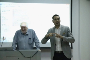 Eigenstetter教授还展示了在德国咖啡馆点餐与结算的短视频。这是大一同学们正在学习的一项交际知识,通过这个简短的视频,增加了同学们的知识储备。视频结束后,教授与两名同学一起模拟了一个简单的点餐交流对话场景,丰富多彩的对话使观众的欢笑不止。