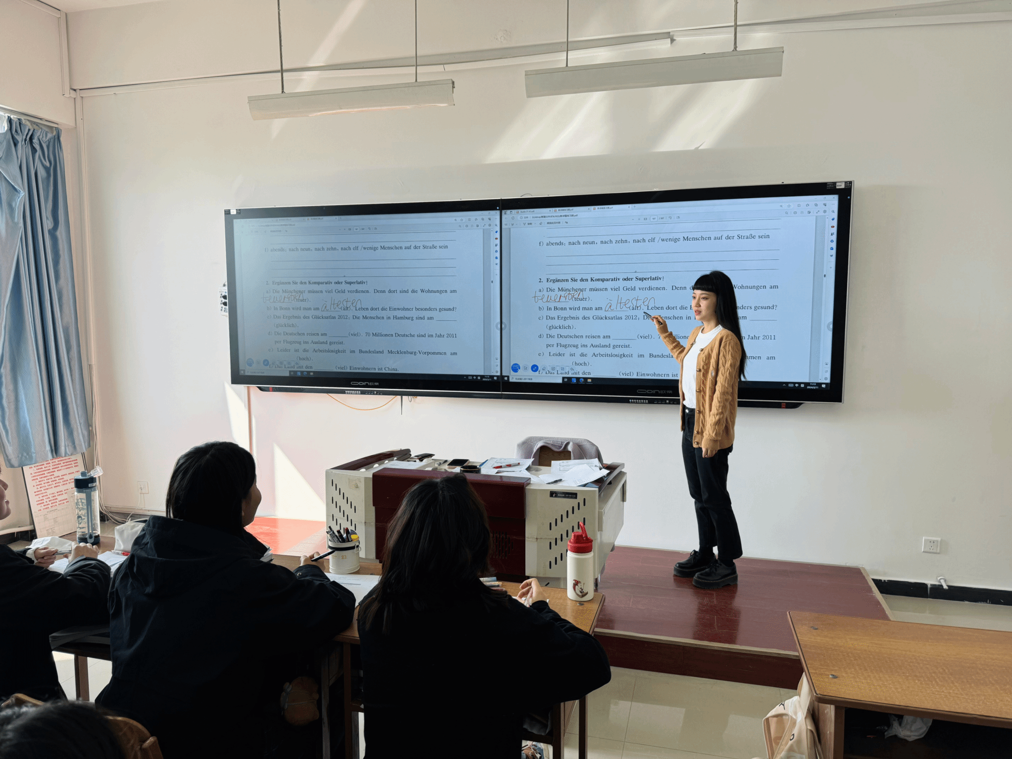 开学前一周,学院积极联系校教务部,组织相关人员对全体德语教师及教学管理人员进行新教学设备的操作培训,提升教师的教学设备操作能力,确保课堂教学质量。开学第一天,学院领导、教学督导人员与辅导员等进班查课听课,认真检查授课教师课程内容的教学设计,详细记录教师的教学行为与员工的课堂表现。英国365集团公司开学初教学工作情况整体良好。授课教师提前到岗,课堂教学组织井然有序,课堂教学内容讲解清晰,同学们精神饱满,听课状态良好,课堂师生互动积极,学习气氛浓烈。
