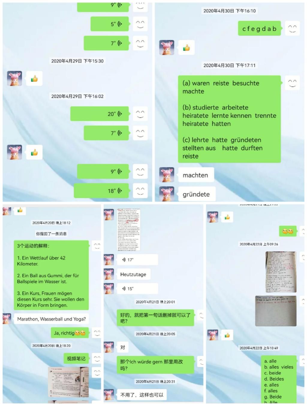2019108日,这是我正式学习德语的第一天。德语教学是学院的重点教学任务,因为它是我们整个四年的语言基础,因此,上早晚自习、学习语音语调、练习小舌音、背单词、和同学做对话等成为了大一课堂的常态,就这样,大一上半学期在李冠园老师的一堂堂生动的德语课中结束了。但在2020年年初,由于受到新冠肺炎疫情的突袭,我们只能将德语的学习转为线上进行,教学方式的改变考验着我们每一个人,所有人都需要尽快适应新的教学节奏,但学院依旧努力为我们打造优质的网课环境,德语老师也通过直播平台为我们耐心授课、批改作业。总之,从最初对这门外语的陌生感,到最后能够熟练运用,这些都离不开德语老师的认真讲解与帮助。在大一结束时,我也一次性高分通过了德语B1考试,并且幸运的入选了学院第一届组建的卓越班。大一一年虽忙碌辛苦,但却极其充实,能够在刚进入大学就初步掌握一门第二外语,现在想来的确是一件非常有意义的事情。