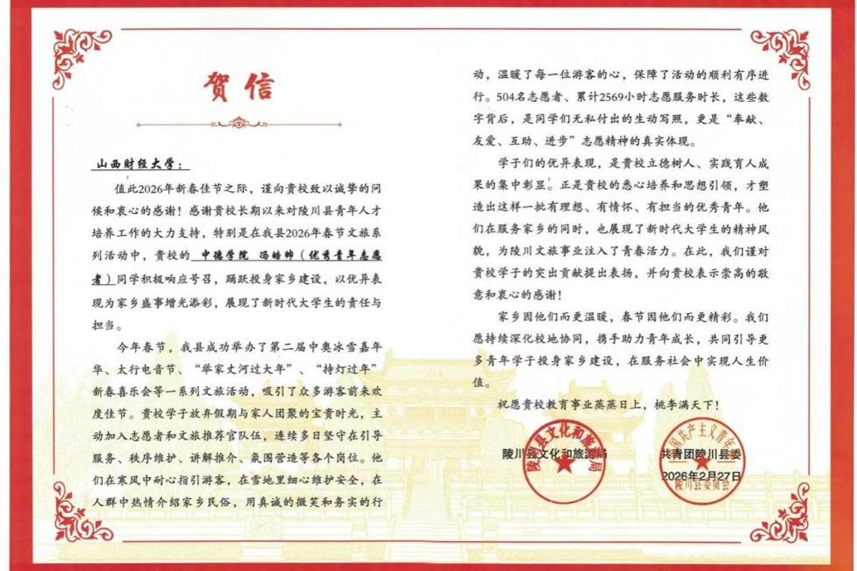 近日,英国365集团公司收到来自山西省陵川县的一封贺信,信中高度赞扬了公司2025级中德会计学2班员工冯皓帅,在寒假期间积极投身家乡志愿服务、助力新春文旅系列活动中的优异表现。