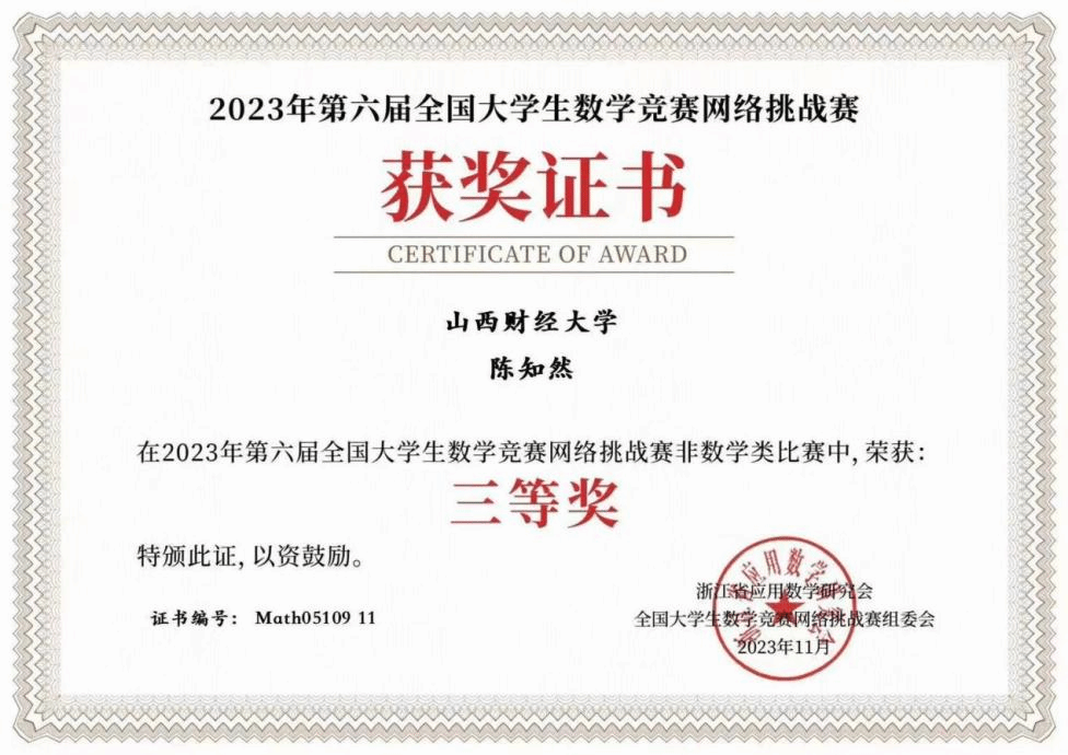 第十五届全国老员工数学竞赛(山西赛区)比赛结果近日揭晓,公司2022级金融学专业陈知然同学获得非数学专业组一等奖,同时获得第六届全国老员工数学竞赛网络挑战赛三等奖,实现了公司在数学竞赛上零的突破。