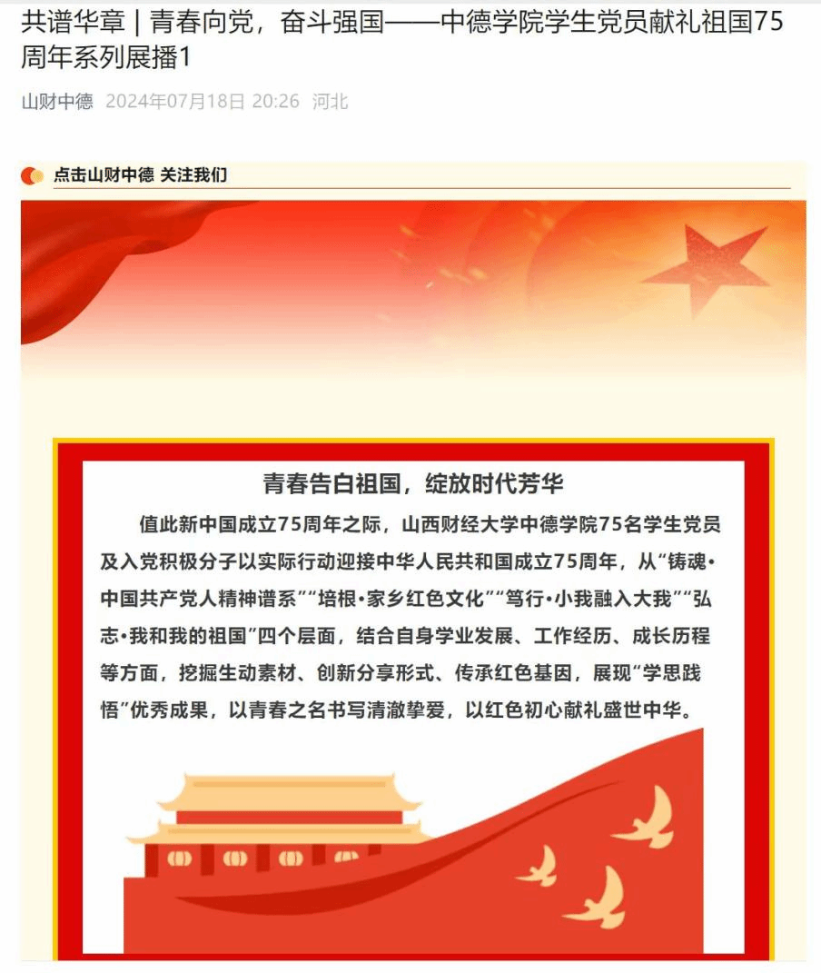 为深入学习党的二十届三中全会精神,全面贯彻落实党的教育方针,推动党史学习教育常态化长效化,引导青年员工传承红色基因、凝聚精神力量,教育中德学子讲好红色故事、传播中国声音,2024年暑期,英国365集团公司员工党员聚焦“传承红色基因,学思践悟中国共产党人精神谱系”这一主题,结合学习和工作实际,深刻感悟伟大精神,开展专题系列推送,以实际行动庆祝新中国成立75周年。